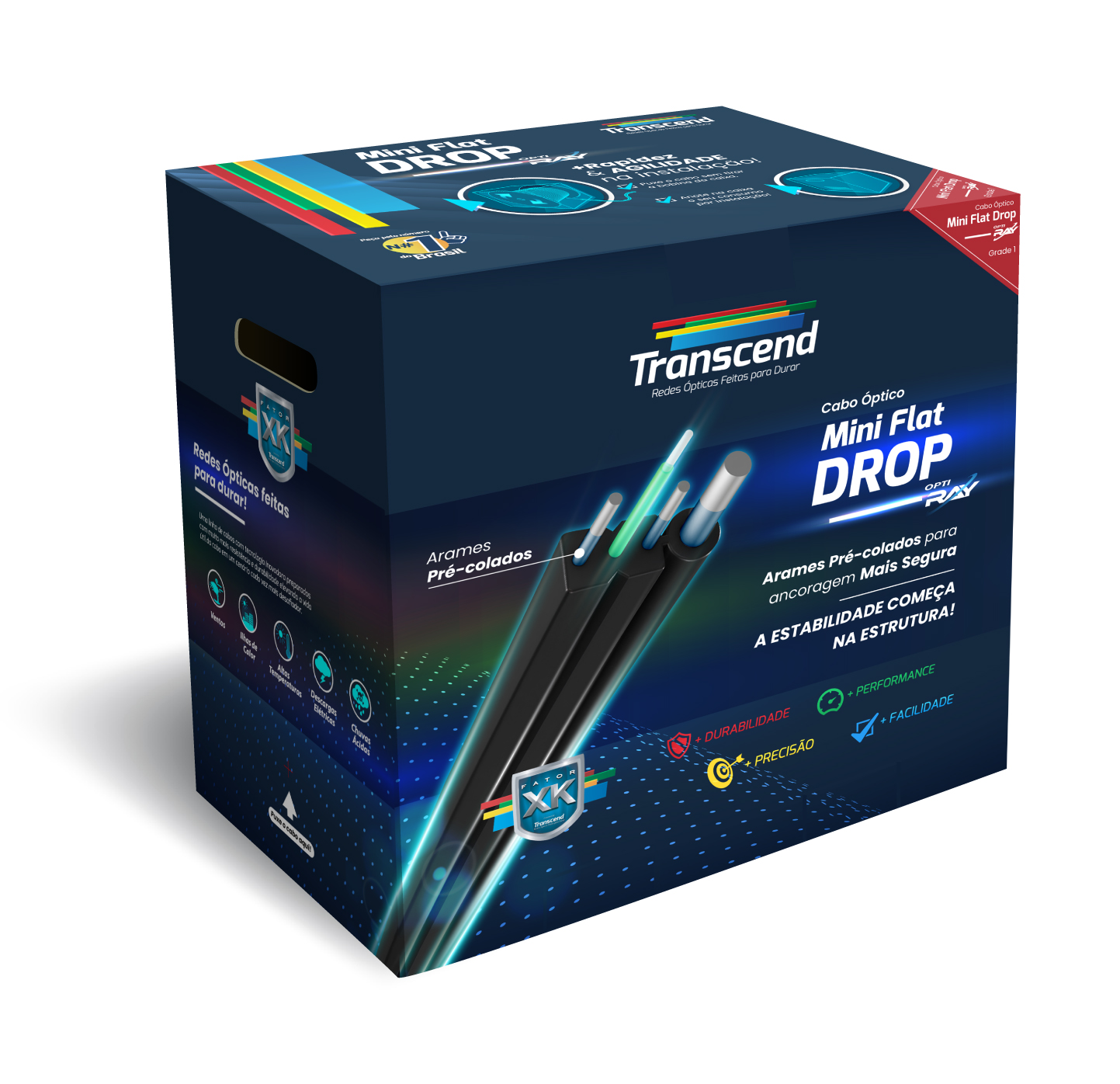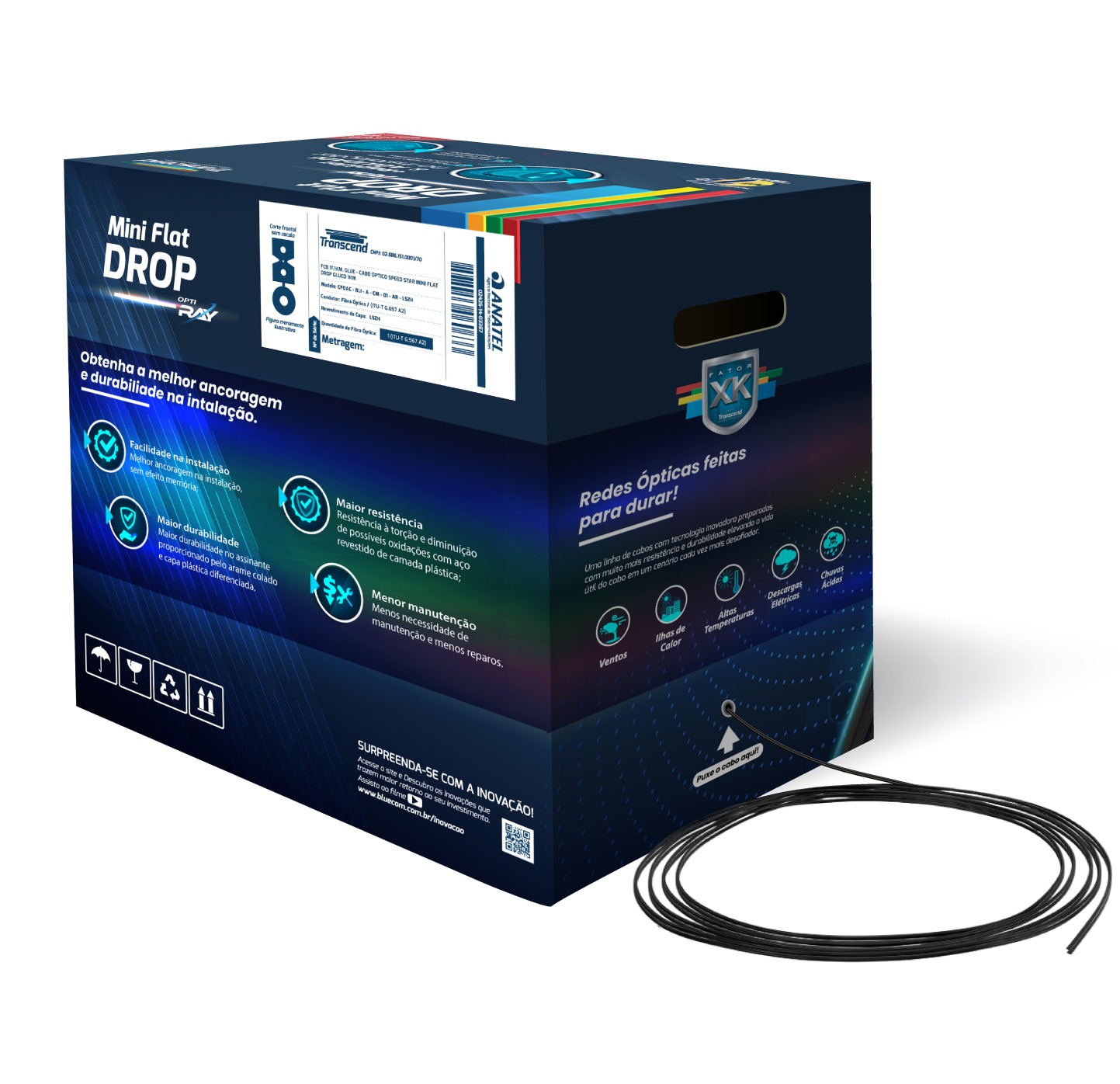 CABO ÓPTICO SPEED STAR MINI FLAT DROP OPTIRAY   foi projetado com capa plástica de alta resistência a tração mecânica, contra intemperismo (sol, chuva e variações de temperaturas) além de baixa emissão de fumaça (em caso de queima), utilizando fibra óptica de baixa sensibilidade à curvatura e elementos metálicos de tração e sustentação revestidos com camada de cola que garantem maior rigidez e resistência ao cabo, de modo a atender aplicações tanto internas quanto externas, onde é exigido um cabo com uma maior qualidade e performance elevada. Utilizando fibra óptica de baixa sensibilidade a curvatura, permite mais dobras no cabo durante as instalações em espaços limitados com menores perdas, aumentando a performance na transmissão.